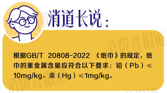 “荧光物质主要是遮盖原料中的不洁物质,以提高产品的白度。”负责本次检测的工程师告诉《消费者报道》记者,根据GB/T 20808—2022《纸巾》的规定,纸巾中不得检出可迁移性荧光物质。