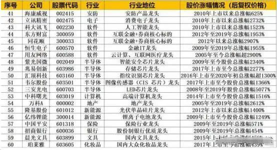 买股票就是买公司,选择好行业中的好公司并长期持有与公司共成长才能给投资者带来丰厚的回报;综合考虑行业特性、公司商业模式、公司成长性、公司盈利能力、公司具备的护城河以及股价长期表现等各方面因素,我筛选出了个人最看好的60只来自各行业、各细分领域优质龙头,个人认为这些个股大部分算得上是A股真正的核心资产,具备很好的中长期投资价值;