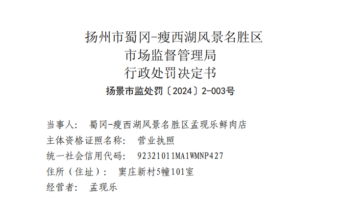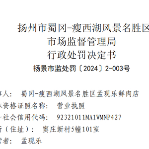 4月10日,记者从国家企业信用信息公示系统网站(江苏)获悉,近日,江苏省扬州市蜀冈—瘦西湖风景名胜区市场监管局公布了一起商家使用不合格计量器具案。