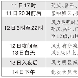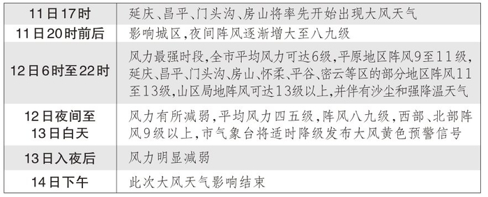 根据大风橙色预警,11日17时延庆、昌平、门头沟、房山将率先开始出现大风天气,20时前后影响城区,夜间阵风逐渐增大至八九级,12日6时至22时为风力最强时段,全市平均风力可达6级,平原地区阵风9至11级,延庆、昌平、门头沟、房山、怀柔、平谷、密云等区的部分地区阵风11至13级,山区局地阵风可达13级以上,并伴有沙尘和强降温天气。