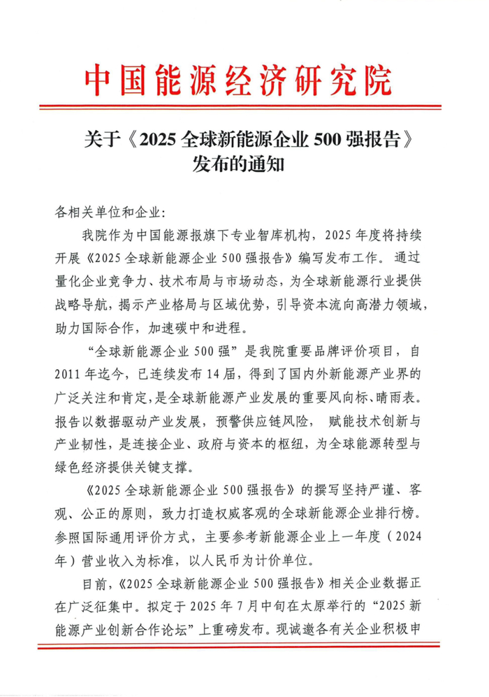 目前,《2025全球新能源企业500强报告》相关企业数据正在广泛征集中。拟定于2025年7月中旬在太原举行的“2025新能源产业创新合作论坛”上重磅发布。现诚邀各有关企业积极申报数据资料,并参加“2025新能源产业创新合作论坛”。