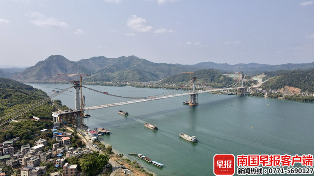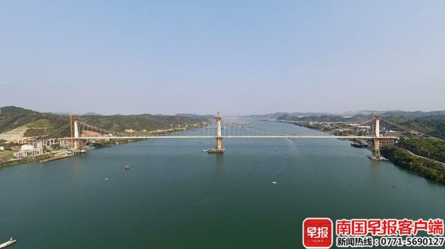 南国早报全媒体记者在大桥上看到,浔江江水清澈,两岸绿树葱郁。站在大桥上,就可以看到不远处的长洲船闸,不时有货船鸣着笛,从大桥下穿过。而许多货船已经停在大桥下游不远处,正在排队等待通过长洲船闸