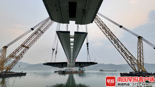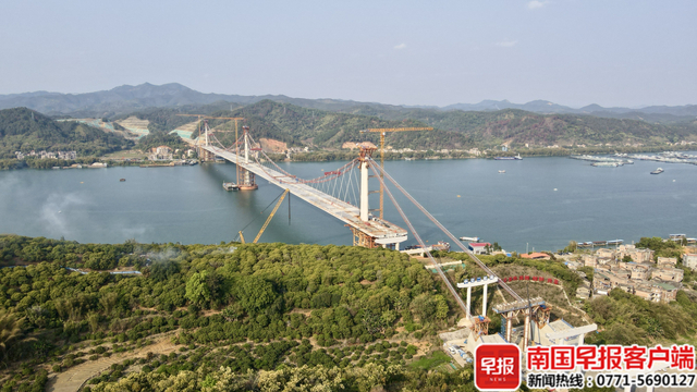 4月10日上午11时许,随着最后一节钢箱梁精准接入合龙口,苍梧至容县高速公路浔江大桥成功合龙,即将进入桥面铺装施工阶段。大桥为目前世界最大跨径独柱式三塔空间缆悬索桥,也是苍容高速公路全线的关键控制性工程,该高速公路预计在今年内通车。
