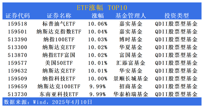 具体来看,标普油气ETF(159518)、纳斯达克指数ETF(159501)、纳指100ETF(513390)、纳斯达克ETF(513300)、纳指ETF富国(513870)、美国50ETF(159577)、纳斯达克ETF(159632)、纳指科技ETF(159509)、纳斯达克100ETF(159659)涨超10%。