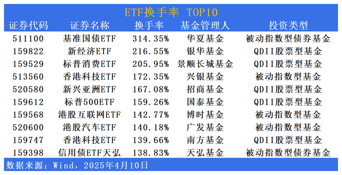 换手率方面,基准国债ETF(511100)换手率居首,达314.35%,新经济ETF(159822)、标普消费ETF(159529)紧随其后。