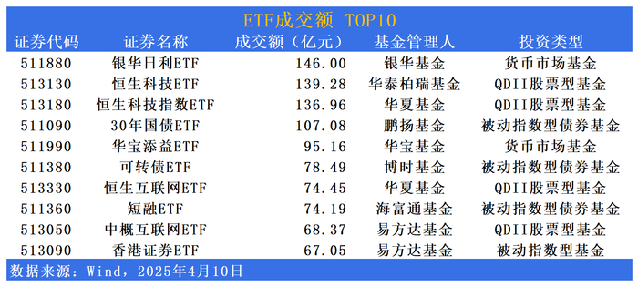 成交额方面,恒生科技ETF(513130)、恒生科技指数ETF(513180)成交额居前。恒生互联网ETF(513330)、中概互联网ETF(513050)、香港证券ETF(513090)进入成交额TOP10。