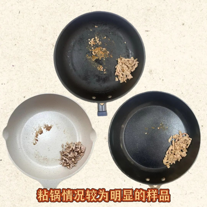上海市消保委使用挂浆肉丝测评,结果显示,有11款样品在初次翻炒挂浆肉丝时能顺滑不粘,余下样品存在不同程度的粘锅情况。综合来看,有6款样品在煎炒鸡蛋和挂浆肉丝时不粘性能表现好。