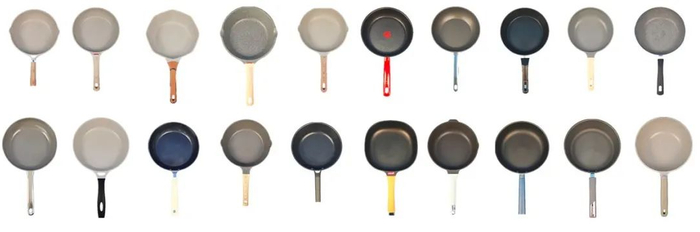 据了解,本次比较试验通过电商平台和线下商超,共计购买了20款平底不粘锅,包含5款特氟龙涂层锅、5款麦饭石(色)涂层锅、5款陶瓷涂层锅以及5款宣称“无涂层”的不粘锅。买样单价在105元至619元不等,样品尺寸在26至28公分之间,重量在1.43至2.35千克之间。