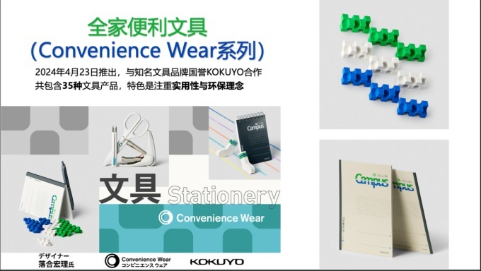 2024年4月23日,Convenience Wear系列还推出了与知名文具品牌国誉(KOKUYO)合作的文具系列。这一系列共包含35种文具产品,特色是注重实用性与环保理念。通过与国誉的合作,全家不仅提升了文具的品质,还通过环保设计赢得了消费者的认可。