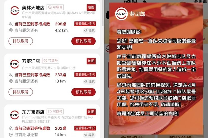 刚刚过去的3月,社交平台上有广州消费者发帖表示,包括美林天地、万菱汇等多家广州寿司郎门店周五需要排队等候超200桌,有评论称17:10分到店需要等候3小时才能入座。一位自称在广州寿司郎兼职3年的员工表示,每逢周末门店需要配备30名以上员工才能正常运转。