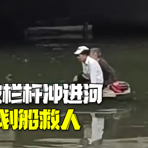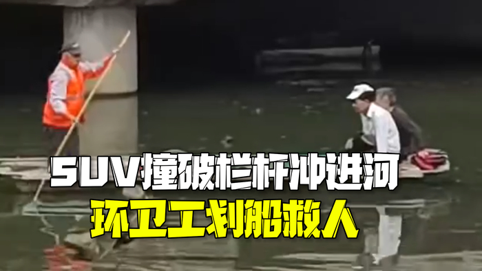 SUV撞破栏杆冲进河里 环卫工划船将被困者救出