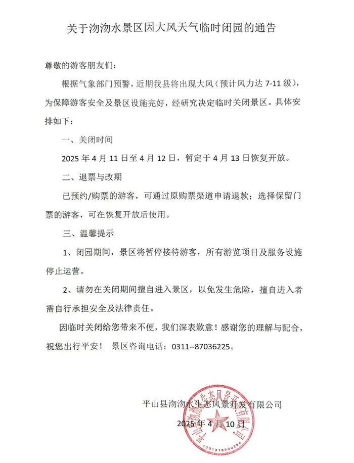 4月10日,河北多家景区发布公告称将临时闭园。