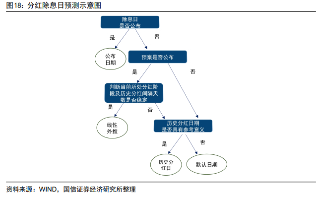 在对公司的分红金额、年度利润、股息支付率进行了估计后,我们还需对公司的除息日进行预测。我们可以按照如下步骤,对上市公司的分红除息日进行预测,其示意图如图18所示: