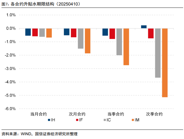 图7展示了各合约升贴水期限结构,总体来看随着标的指数覆盖的市值区间变小,股指期货的贴水幅度越深。