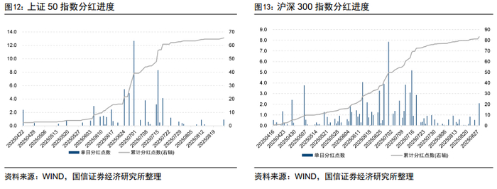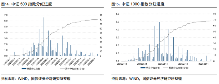 为了更加详细地展示各指数的分红进度,图12-图15分别展示了上证50指数、沪深300指数、中证500指数和中证1000指数的预测分红进度,可以看到成分股分红基本分布在8月。