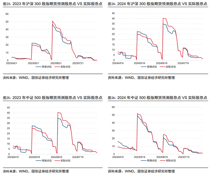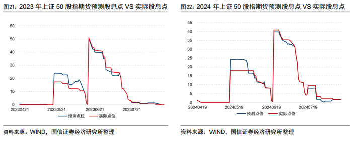 下面,我们对具体的股指期货预测股息点与实际股息点之间的偏离进行检验。图21-图26分别展示了2023年及2024年上证50、沪深300及中证500股指期货当月主力合约的预测股息点与实际股息点,其中期货合约的实际股息点我们以当前时间到期货合约到期日之间对应的股息点指数作为代替。