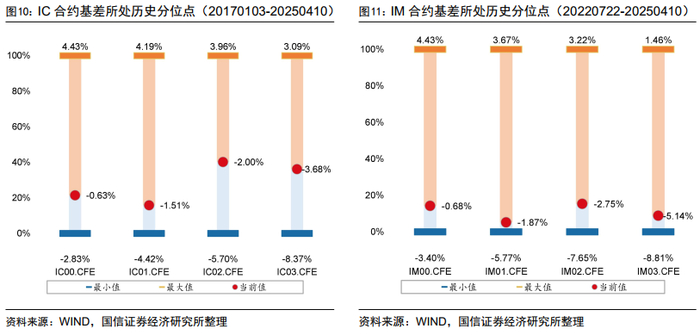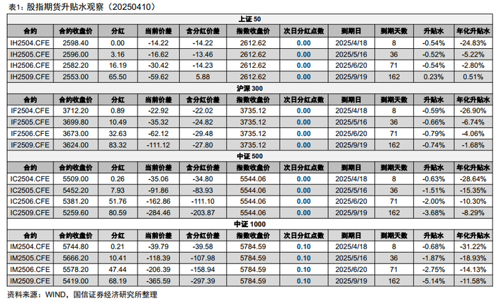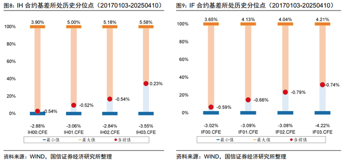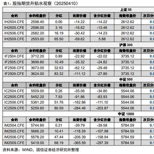 截至2025年4月10日,IH主力合约年化贴水24.83%,IF主力合约年化贴水26.90%,IC主力合约年化贴水28.64%,IM主力合约年化贴水31.22%。