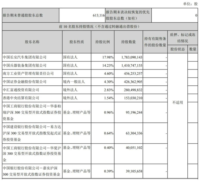 截至2024年12月31日,中国长安汽车集团有限公司持股为17.99%,中国兵器装备集团有限公司持股为14.23%,南方工业资产管理有限责任公司持股为4.6%,中国证券金融股份有限公司持股为4.3%,中汇富通投资有限公司持股为2.83%,香港中央结算有限公司持股为1.2%;