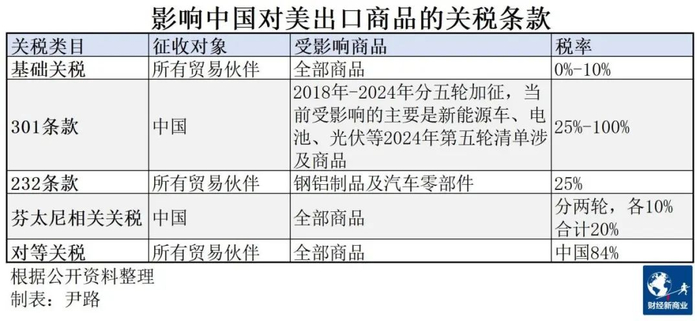 目前影响中国对美出口商品的关税条款有很多,包括基础关税(税率0%-10%);301条款关税(税率25%-100%);232条款关税(税率25%),2025年2月和3月两次以芬太尼管控不力为借口加征的关税(合计税率20%),以及此次加征的对等关税(税率84%)。这些关税种类有的需要叠加,有的征收A就不用征收B,关税组合异常复杂。