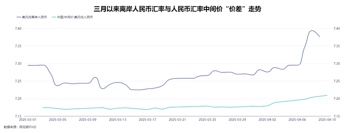 4月8日至10日,人民币对美元汇率中间价跌幅分别仅有58个基点、28个基点与26个基点,令中间价与离岸人民币的汇差一度扩大至约1500个基点。金融市场对此的解读是,相关部门或通过逆周期因子引导中间价跌幅相对平稳,从而抑制即期人民币汇率跌幅,呈现较强的“稳汇率”意图。