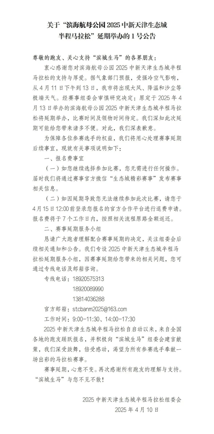 经赛事组委会审慎研究决定:原定于2025年4月13日举办的滨海航母公园2025中新天津生态城半程马拉松将延期举办,比赛时间及领物时间待定。我们深知此次延期可能给您带来诸多不便。对此,我们深表歉意。
