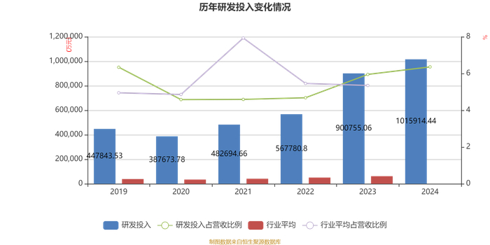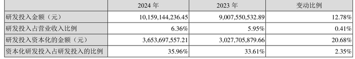 2024年全年,公司研发投入金额为101.59亿元,同比增长12.78%;研发投入占营业收入比例为6.36%,相比上年同期上升0.41个百分点。此外,公司全年研发投入资本化率为35.96%。