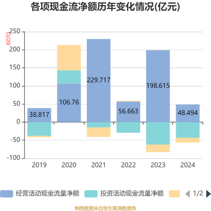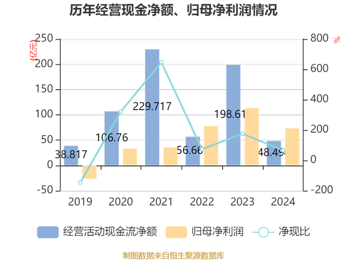 截至2024年,公司经营活动现金流净额为48.49亿元,同比下降75.58%;筹资活动现金流净额-13.91亿元,同比增加7.37亿元;投资活动现金流净额-43.13亿元,上年同期为-62.08亿元。