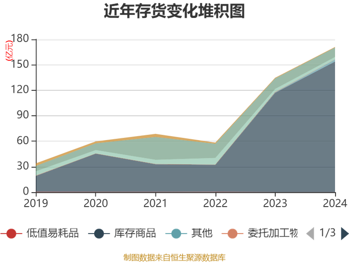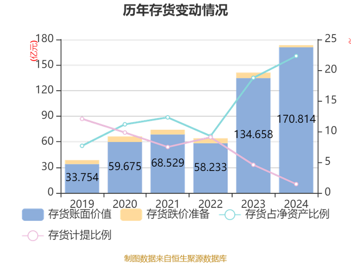 从存货变动来看,截至2024年末,公司存货账面价值为170.81亿元,占净资产的22.31%,较上年末增加36.16亿元。其中,存货跌价准备为2.47亿元,计提比例为1.43%。