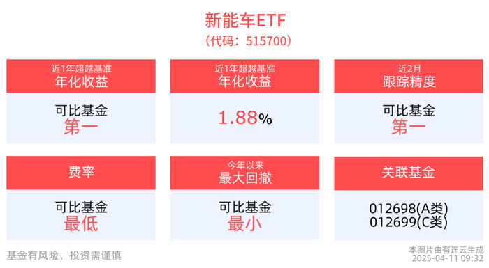 跟踪精度方面,截至2025年4月10日,新能车ETF近2月跟踪误差为0.009%,在可比基金中跟踪精度最高。