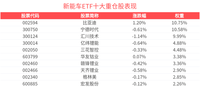 数据显示,截至2025年3月31日,中证新能源汽车产业指数(930997)前十大权重股分别为比亚迪(002594)、汇川技术(300124)、宁德时代(300750)、三花智控(002050)、亿纬锂能(300014)、华友钴业(603799)、赣锋锂业(002460)、格林美(002340)、天齐锂业(002466)、宏发股份(600885),前十大权重股合计占比57.98%。