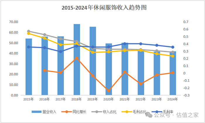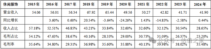 休闲服饰:从2015年到2024年,休闲服饰收入从54.06亿元降低23%至41.90亿元,CAGR为-2.79%。公司休闲服饰的收入占比从2015年的57.18%降到2024年的28.65%,毛利占比从54.12%降到2024年的23.20%,毛利率不如儿童服饰高,近三年毛利率略有下降,详见下表、图。可以看出休闲服饰的市场空间虽然比儿童服饰大,但是所面临的竞争更加激烈。潮流趋势和客户的消费偏好在变,没有哪家休闲服饰业务能够一直长红,需要不断地去了解市场、了解消费者,然后做出正确的调整。从数据来看,公司的休闲服饰业务有点“没落”了,但正因为市场空间大,这也是它最有可能发力增长的业务模块。从2024年新增的自营形象店以及邀请张新成、陈都灵、郑合惠子、徐志胜等代言的营销活动,都可以看出公司很看重这块业务,在主动跨界破圈,突破森马品牌给人的固有印象。