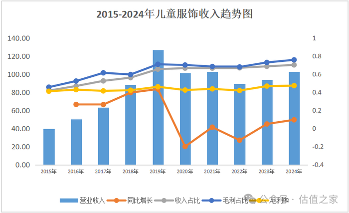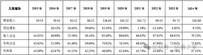 儿童服饰:从2015年到2024年,儿童服饰收入从39.53亿元增长1.6倍至102.68亿元,CAGR为11.19%,儿童服饰业务除了2020年和2022年有所下降外,其余年份均为增长,详见下表、图。儿童服饰业务也是从第二大业务成为目前的第一大业务,营收占比达七成,毛利占比达75.81%,毛利率也常年保持稳定并有增长态势。过去十年,公司儿童服饰品牌巴拉巴拉在中国童装市场市占率稳居第一,短期内也较难被超越。