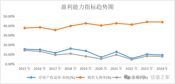 归母净利润从13.49亿元下降16%至11.37亿元,2015-2024年间的CAGR为-1.88%。其中2021年涨幅最大(+84.50%),2024年涨幅最小(+1.42%)。2022年降幅最大(-57.15%),2019年降幅最小(-8.52%)。2020年和2022年降幅较大,主要疫情这一不可抗力因素影响。