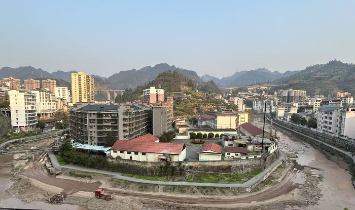 河流蜿蜒而过包裹着小县,但如今正值枯水期。