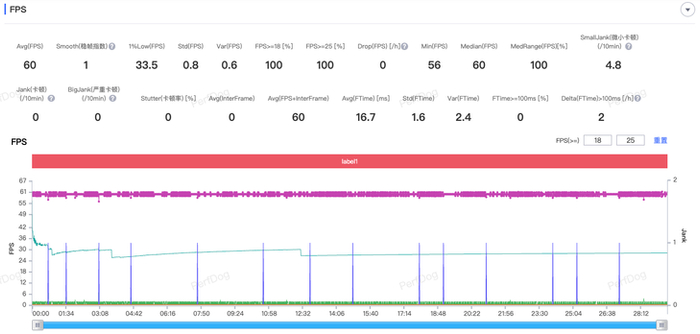 游戏体验方面,我们选取了性能要求严苛的《崩坏:星穹铁道》进行30分钟跑图测试,Perfdog测试结果显示,OPPO Find X8s+能够以平均60FPS的帧率稳定运行这款大型游戏,没有出现卡顿情况。