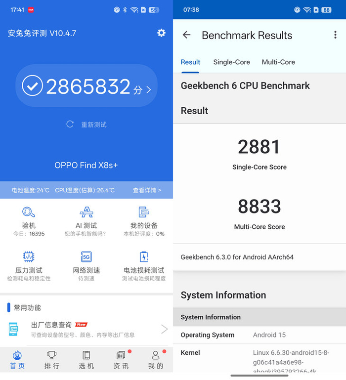 在性能实测环节,OPPO Find X8s+展现出了强悍的实力。安兔兔跑分测试中,它轻松突破286万分大关;GeekBench6测试中,单核成绩2881,多核成绩8833,这样的表现足以让它在安卓旗舰阵营中脱颖而出,轻松应对日常各种使用场景。