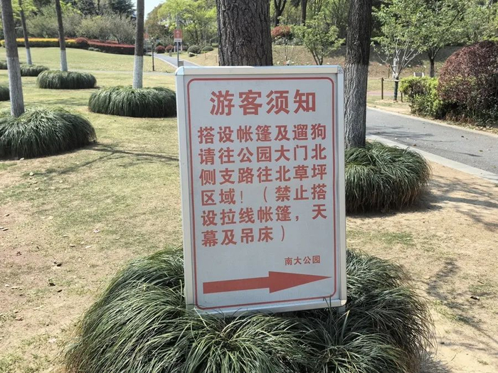 在社交媒体上,南大公园也是露营的热门推荐地,这个占地面积颇大的公园,辟设出了北部约1/3的区域供市民搭设帐篷。不过,从大场路公园正门入内后,不管是左手侧的“告知书”,还是正前方的“游客须知”,都用醒目的大字写着禁止搭设天幕和拉线帐篷的字样。在公园担任门卫兼保安的章师傅告诉记者,公园曾因天幕风绳绊倒孩子发生过意外,此后就一直禁止拉设天幕和拉线帐篷,“这样规定已经有四五年了”。
