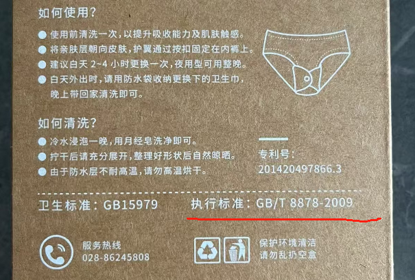 有消费者在网上分享了该品牌水洗卫生巾的外包装,记者发现上面标注的卫生标准为GB 15979(一次性使用卫生用品卫生相关的标准和要求),执行标准为GB/T 8878-2009《棉针织内衣》,而该标准早已于2015年6月被废止。记者向商家客服询问600元豪华套装的执行标准,截至发稿,未获明确答复。