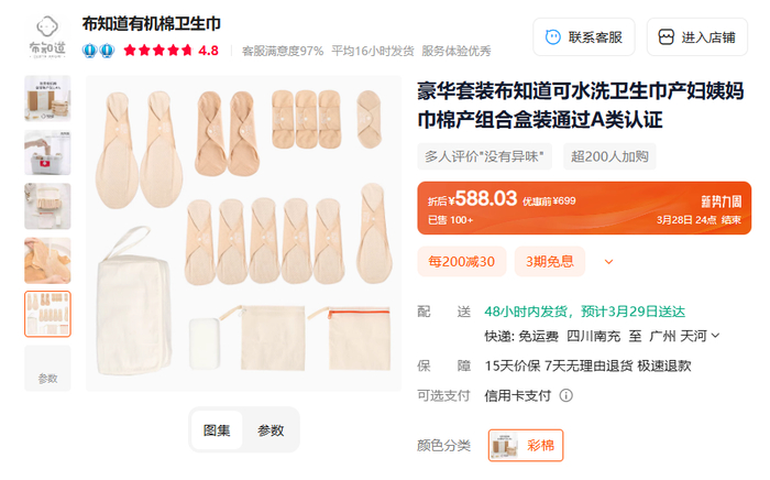 不过,并非所有水洗卫生巾的价格都便宜。记者在某电商平台上就发现一款14片装的豪华套装组合产品,优惠前的售价为699元,折后也要588元。