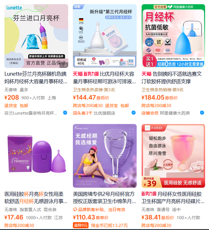 月经杯减少了传统卫生巾频繁更换的麻烦,还可以做到无气味、不捂闷,长期使用的成本也比较低。以目前电商平台上销售的产品来看,一些知名品牌的月经杯售价在一两百元上下,部分小品牌的国产月经杯可以低至十几元,保养得当可用10年甚至更长。