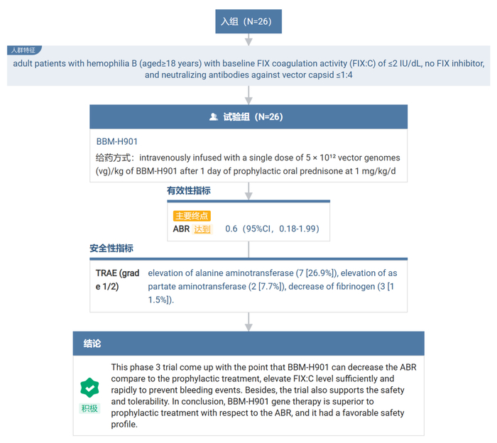 该研究是一项多中心、单臂、III 期临床研究(NCT05203679),旨在评估单次静脉输注 BBM-H901 注射液治疗血友病 B 患者的安全性和有效性。研究的主要终点包括 BBM-H901 注射输注后 52 周内的年化出血率(ABR)。