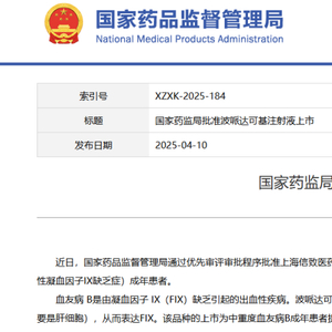 4 月 10 日,NMPA 官网显示,信念医药的 1 类新药波哌达可基注射液(商品名:信玖凝,研发代号:BBM-H901)获批上市,用于治疗血友病 B(先天性凝血因子Ⅸ缺乏症)成年患者。