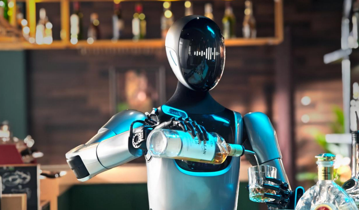 目前在餐厅中,XMAN-R1可以独立完成取酒、倒酒、放置托盘等配餐动作,学习服务人员动作逻辑与姿态,从双手递物到移动控制,融入场景需求,并通过机器间任务调度,将餐品交接给配送机器人T10按最优路径送餐,并在最后完成桌面清理任务。
