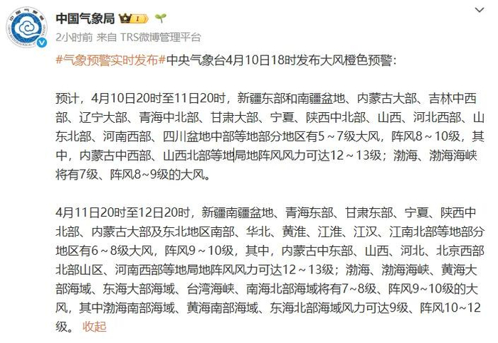 这次的较强冷空气来袭,给我国多地带来激烈天气。中央气象台昨天(4月10日)18时发布罕见的大风橙色预警信号,部分地区阵风风力可达12~13级。