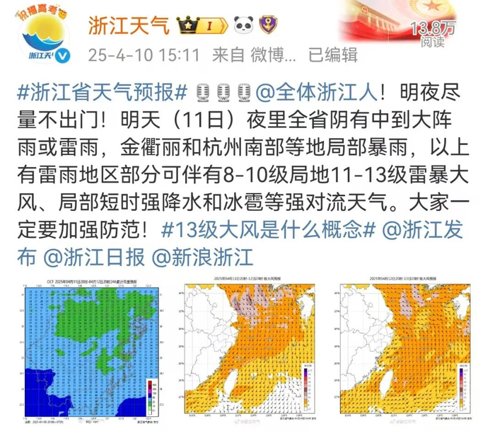 昨天下午,@浙江天气 发出提醒消息:@全体浙江人,11日夜里尽量不出门。
