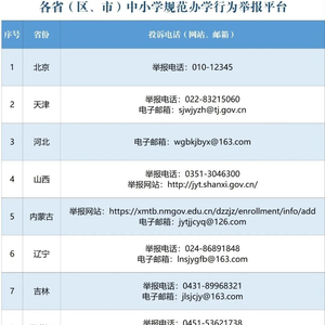 同时,教育部还统一公布了各省(区、市)教育行政部门中小学规范办学行为投诉举报电话和电子邮箱等,畅通举报渠道,接受社会监督。