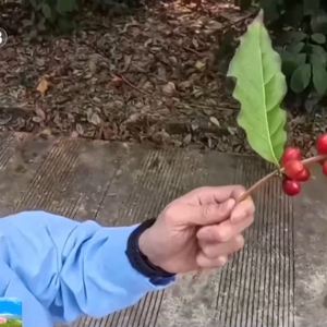 主播 陈怡博:来到了云南德宏热作所,这里都是各种各样的咖啡树,在我手上拿的这个特别像小樱桃一样的东西,就是云南小粒咖啡。小粒小粒,顾名思义,因为它的粒比较小,和罗布斯塔中粒咖啡、利比里卡大粒咖啡比起来,它的体积看起来非常小,所以叫作小粒咖啡。