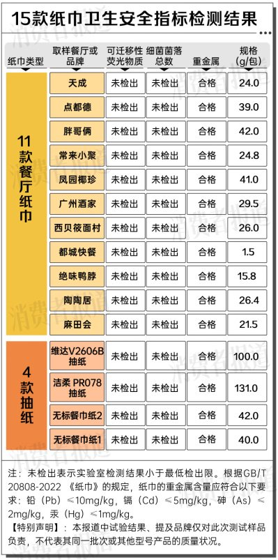 消费者最关心的莫过于这15款纸巾的卫生安全指标,例如可迁移性荧光物质、重金属(铅、镉、砷、汞)、细菌菌落总数。