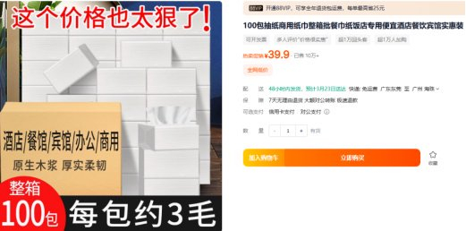 另一种无标餐巾纸,一般是透明的包装,没有任何的品牌或生产厂家标识,规格为40g~150g每包,商家通常将其放在桌子上供消费者取用。无标餐巾纸在电商平台上价格较便宜,一般0.3元~0.5元每包,大批量采购价格可更实惠。