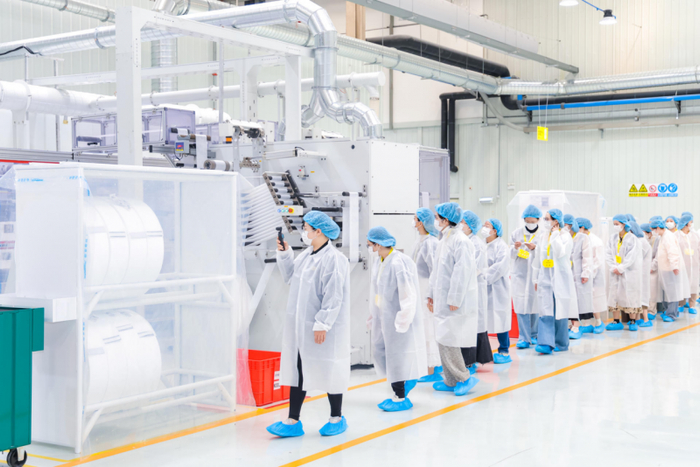 穿上防护服,经过消毒风淋室,在一踏入自动化无尘生产车间的瞬间,消费者们就被眼前的景象所震撼。现代化的生产设备高速而有序地运转,一片卫生巾会经历从原材料到芯体成型,再到面层材料复合,最后完成包装,整个过程都是在封闭的机器里完成,确保消费者是第一个接触到产品人。与此同时,高精度的“污点相机”及自动纠偏装置,可检测发丝大小的瑕疵,金属、异物、残次品等均会被自动剔除,确保产品“零缺陷”。生产线的智能化、洁净程度让参观的消费者对产品品质充满了信心。